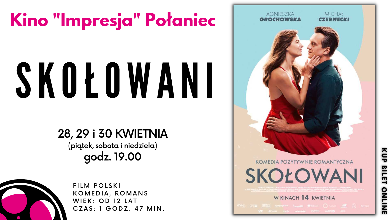 "SKOŁOWANI" w Kinie "Impresja" Połaniec: 28, 29 kwietnia (piątek, sobota) godz. 19:00 30 kwietnia (niedziela) o godz. 19:00 DUBBING FILM POLSKI KOMEDIA, ROMANS WIEK: od 12 lat Czas projekcji: 1 godz. 47 min
