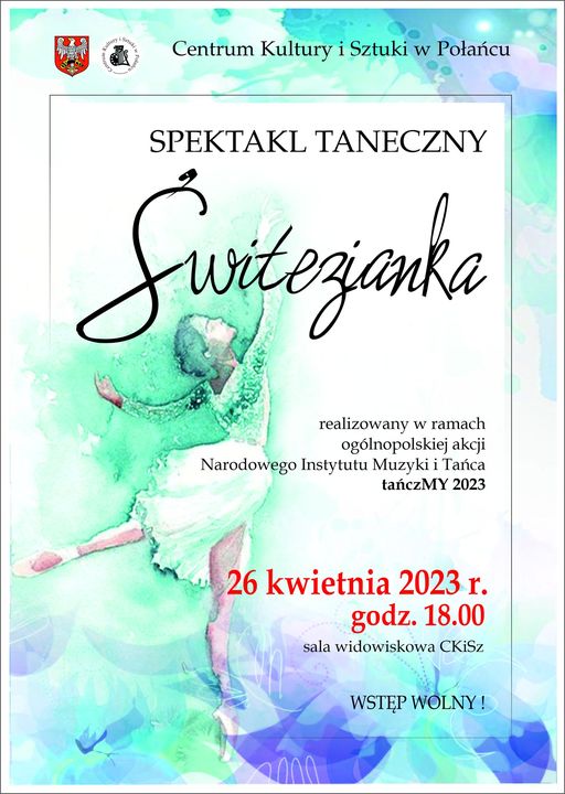 Wydarzenie w ramach ogólnopolskiej akcji #tańczMY Narodowego Instytutu Muzyki i Tańca. Już jutro, 26 kwietnia zapraszamy o godz. 18.00 na piękny spektakl taneczny "ŚWITEZIANKA" oparty na motywach ballady Adama Mickiewicza o tym samym tytule.... Reżyserem i choreografem spektaklu jest Weronika Koziarz-Dygulska, a zatańczą tancerki z grupy DIGRESS. Wstęp wolny. Gorąco zapraszamy i Ty przyłącz się do akcji i za #tańczMY