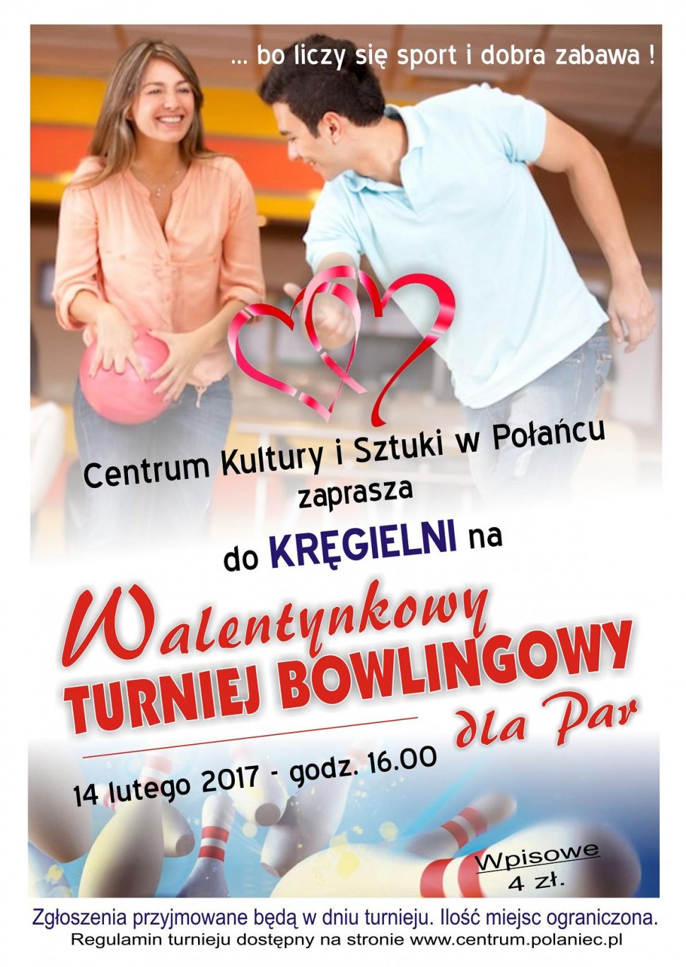 14 lutego od godz. 16.00 zapraszamy do kręgielni CKiSz na III Walentynkowy Turniej Bowlingowy dla Par. Prosimy o zabranie ze sobą drugiej połówki i mega chęci do wspólnej gry, bo liczy się sport i dobra zabawa. Koszt udziału w turnieju to jedynie 4,00 zł od pary. Zgłoszenia do turnieju przyjmujemy już od dziś w Kręgielni CKiSz. Każdy z uczestników bierze udział w turnieju na własną odpowiedzialność.
