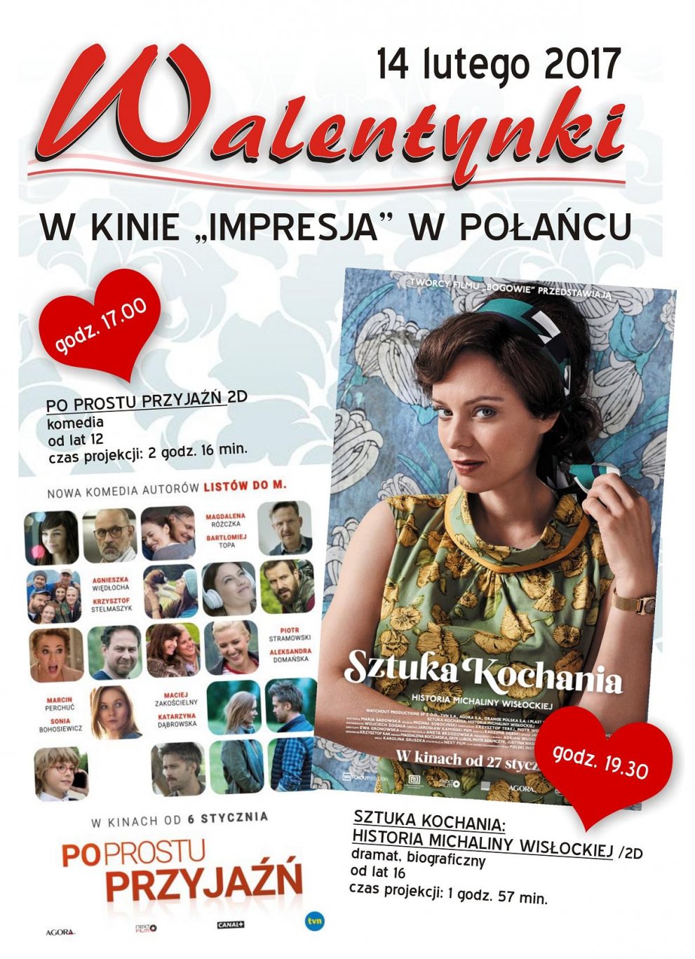 Jeżeli jednak planujesz spędzić ten dzień w kinie ze swoją drugą połówką oraz najlepszymi filmami, wybierz coś idealnego! "WALENTYNKI W KINIE". Znakomity wieczór z dwoma polskimi produkcjami. Zaczynamy komediowo o godz. 17.00. filmem "Po prostu przyjaźń". Kończymy "Sztuką kochania. Historia Michaliny Wisłockiej." Cena biletu na każdy seans to 14.00 zł. Walentynkowe bilety można nabyć tylko w kasie kina. Zapraszamy!