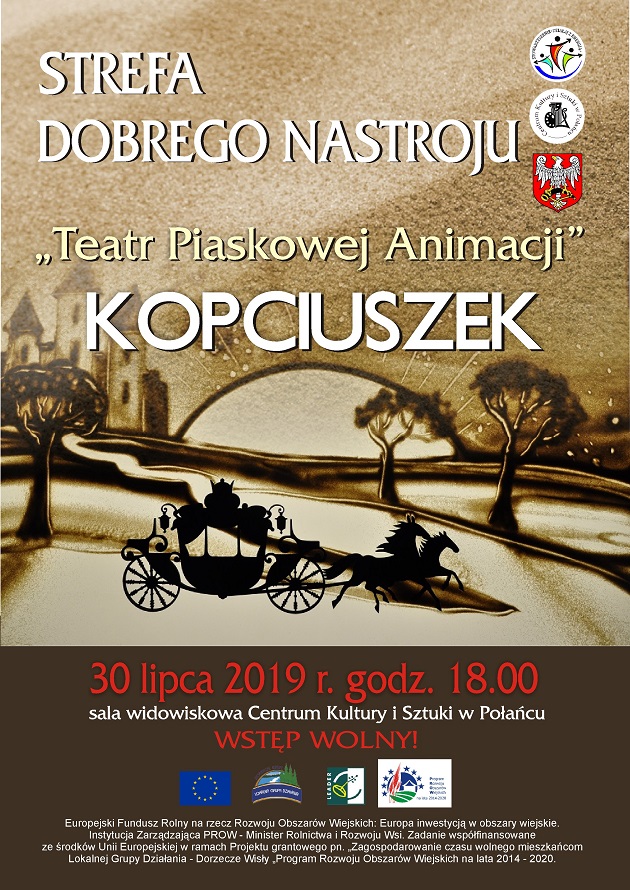30 lipca o godz. 18.00 zapraszamy do Teatru Piaskowej Animacji na spektakl "Kopciuszek” w wykonaniu Mariny Rysicz i Svitlany Orlovej. To niezwykłe połączenie muzyki i wzruszającej historii, która powstaje z piasku na oczach widza. Piaskowa Animacja rozwija wyobraźnię, otwiera na ciekawe przestrzenie artystyczne. Artystki zabiorą widzów do magicznego świata baśni.....