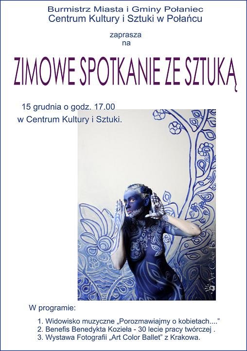 Nawiązaniem do tematu przewodniego „Zimowego spotkania ze sztuką” będzie jedyna w swoim rodzaju wystawa fotografii Art Color Ballet z Krakowa. Efekt eksperymentu performance łączącego malarstwo na ciele z żywą muzyką i tańcem. Otwarcie tej niezwykle intrygującej wystawy Agnieszki Glińskiej, pokazującej piękno kobiecego ciała w trakcie „Zimowego spotkania ze sztuką”.
