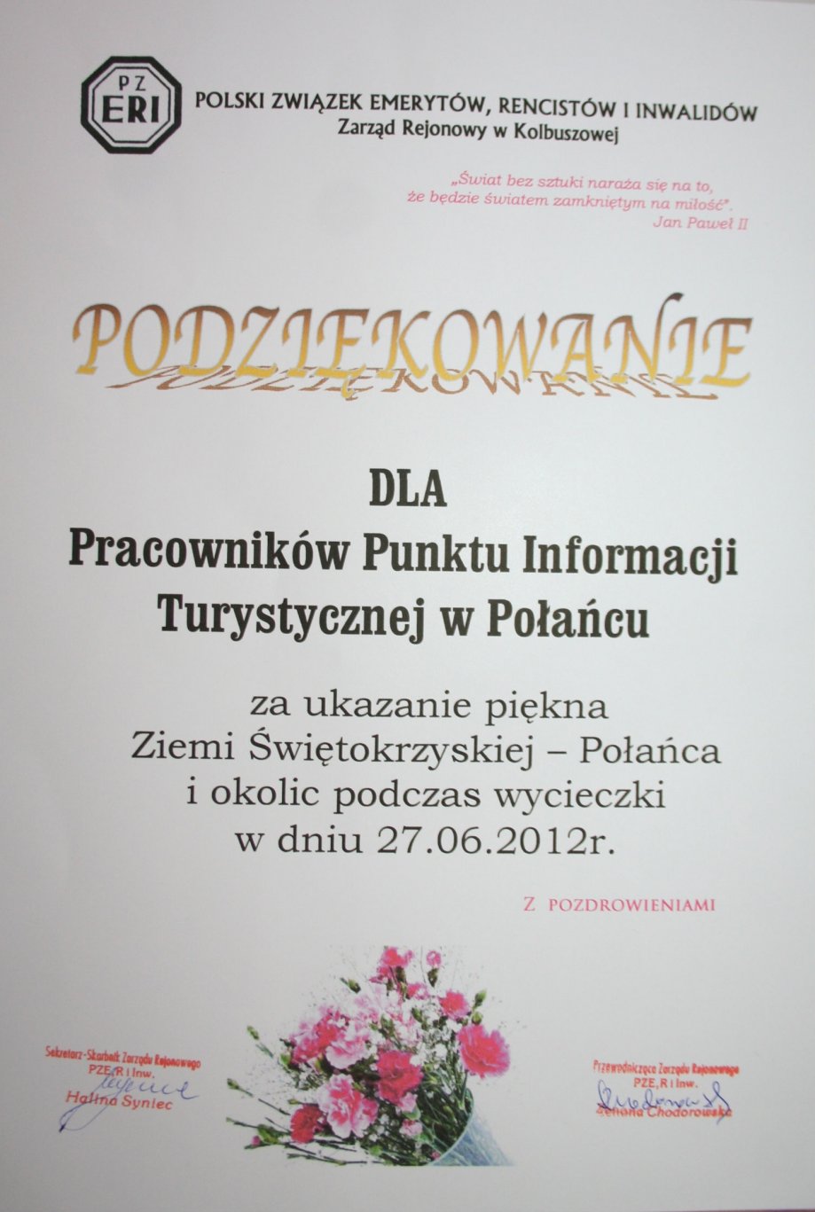 O tym, że Połaniec jest pięknym , prężnie rozwijającym się miastem z bogatą historią, przekonali się 27.06.2012r. turyści z Polskiego Związku Emerytów, Rencistów i Inwalidów z Kolbuszowej. 46 osobowa grupa pod okiem pracowników PIT rozpoczęła zwiedzanie od Placu Uniwersału Połanieckiego, jednego z ulubionych miejsc spotkań mieszkańców naszego miasta. Po wpisaniu się do Księgi Gości w Punkcie Informacji Turystycznej turyści udali się do Kościoła św. Marcina, którego najstarszą częścią jest XVIII- wieczna Kaplica Matki Bożej Różańcowej. Goście mogli także zobaczyć odnowione stuletnie organy. Po obejrzeniu zabytkowej budowli podążyli w kierunku ul. Osieckiej, gdzie znajduje się zabytkowa kaplica cmentarna z 1910 r. oraz okazały grobowiec rodziny Knothe. Wracając ul. 11 Listopada zwiedzający mieli okazję poznać naszego lokalnego rzeźbiarza- pana Józefa Regułę i podziwiać jego galerię rzeźb. Następnym etapem wycieczki było pokazanie najważniejszych miejsc historycznych Połańca- Kopca Kościuszki, skarpy wiślanej z kamieniem upamiętniającym miejsce pierwszego grodu z VI- VII wieku, a także pomnika Tadeusza Kościuszki.