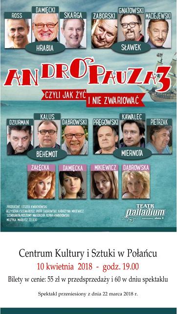 10 kwietnia  2018 godz. 19.00 Komedia „Andropauza 3 - czyli jak żyć i nie zwariować! ” to kontynuacja znanych i popularnych przedstawień „Andropauza – męska rzecz, czyli zdecydowana odpowiedz na Klimakterium  oraz „Andropauza 2 – męska rzecz być z kobietą „.